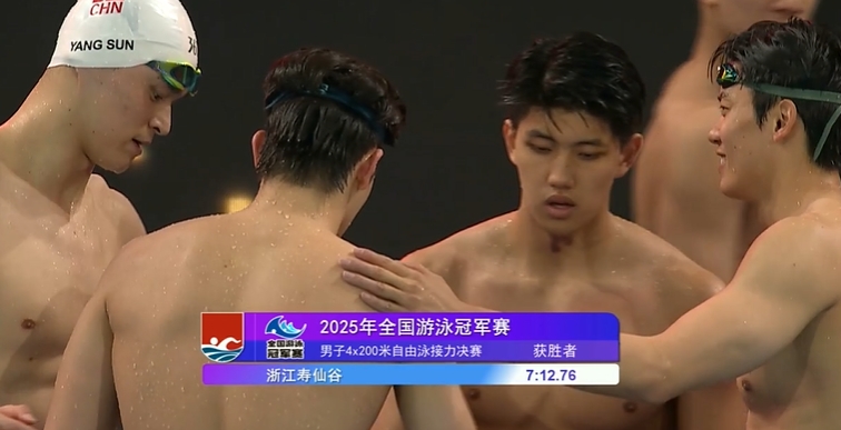 男子4×200米接力决赛,浙江队汪顺、费立纬、孙杨和潘展乐组成的豪华阵容夺金